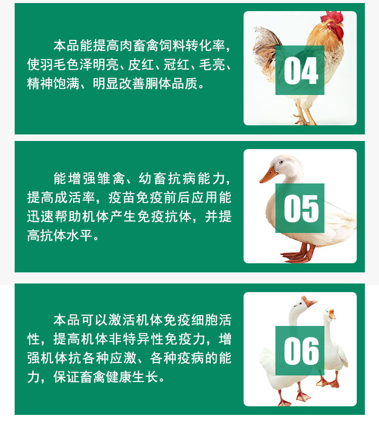3、增進(jìn)食欲,促進(jìn)生長,明顯提高日增重,提高生產(chǎn)效率。