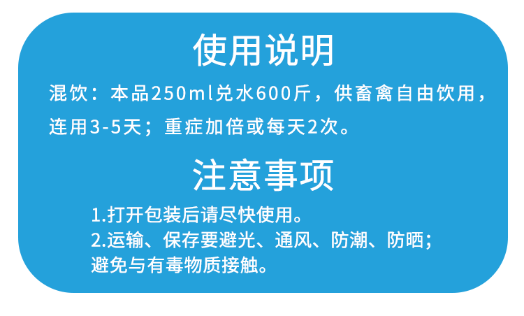 【用法用量】混飲:本品250m兌水600斤,供畜禽自由飲用,連用3-5天;重癥加倍或每天2次。