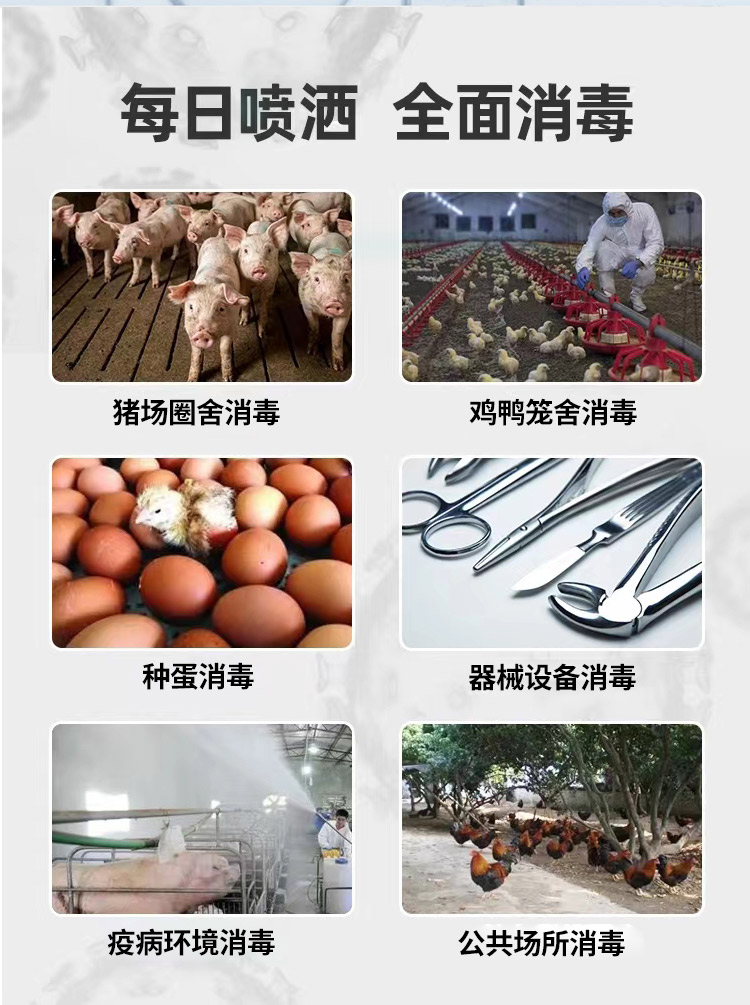 產品簡介:用于家禽、家畜、水產養殖等的緊急消毒和預防消毒,防止疫情暴發。